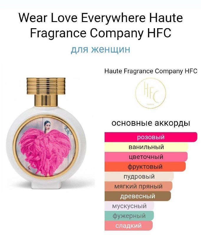 Wear Love Everywhere – цветочный женский аромат, созданный в 2017 году парфюмером Винсеном Рикором для молодого модного бренда нишевой парфюмерии Haute Fragrance Company из Франции. Парфюм наполнен чарующими цветочными ароматами, на фоне которых особенно звонко и чисто звучат розовые ноты символа бесконечной долгожданной любви, что изысканно подчеркнуто креативным дизайном флакона, разработанного художником Артуро Элен и модным дизайнером Маттео Чибика. Вкусные терпковато-вяжущие оттенки черной смородины, обворожительные ноты медовой розы со специевым акцентом розового перца открывают аромат, страстно переплетаясь в «сердце» композиции с пьянящим ароматом цветочного букета и чувственным пряно-бархатистым аккордом королевской розы. Мягкий притягательный шлейф парфюма Haute Fragrance Company Wear Love Everywhere струится нежными сливочными оттенками сандала, тонким запахом амбры и капелькой соблазнительной сладостной ванили.